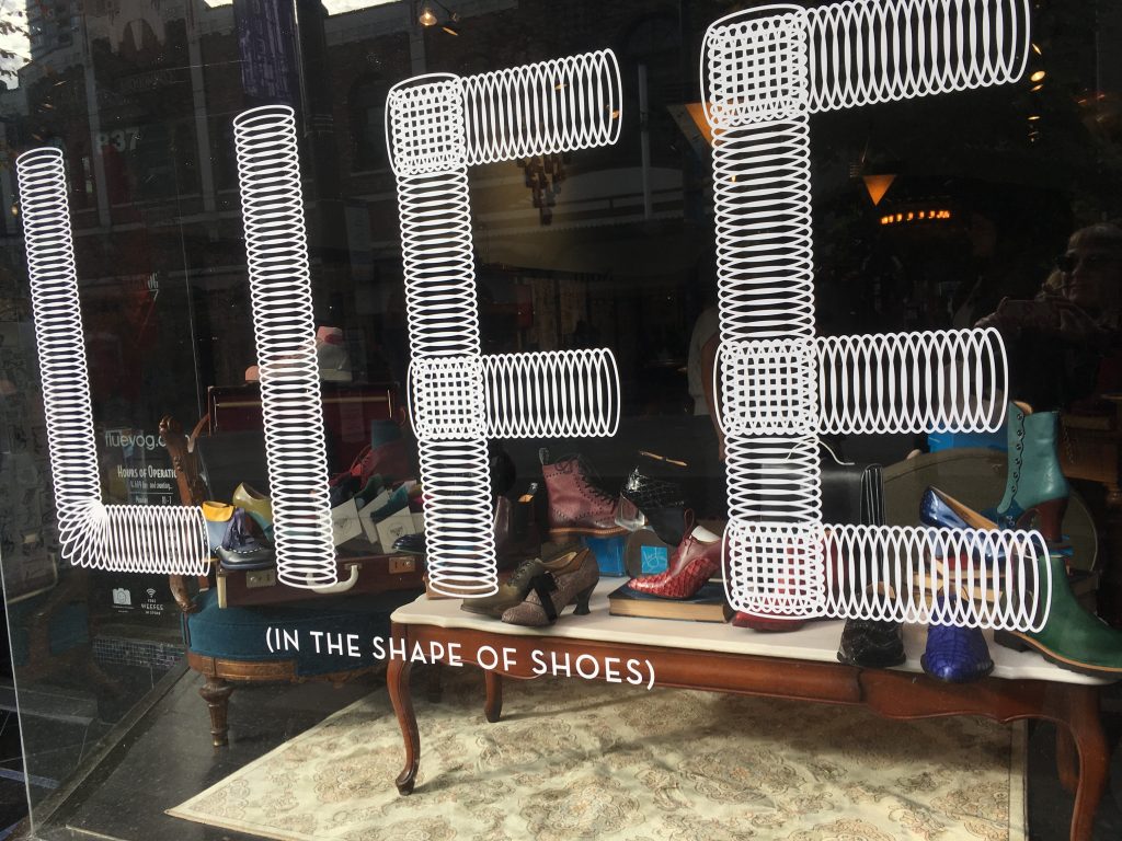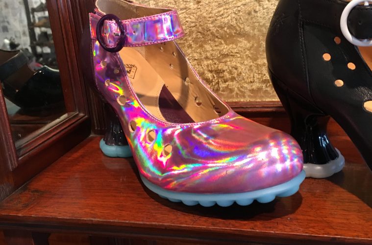 Fluevog’s store on Granville Street in Vancouver, its whimsical façade adorned with gilded angels and neon lights, recalls a world of magic and fantasy. One of the city’s oldest and longest streets, gritty Granville stands “in sharp contrast to Vancouver’s modern, ‘city-of-glass’ architecture” (Siemens, Theatre 77). Subject to flamboyant gentrification in recent years, this street still preserves some old-fashioned landmarks, such as two venerable entertainment venues, the Orpheum and the Vogue (dating from the 1920s and the 1940s, respectively). The Fluevog store (opened in 1973) initially “was an elaborate bedroom, with shoes gracing a giant bed” (“Our Story – About Fluevog”). As described on the brand’s official website, one of John Fluevog’s first designs was The Pilgrim (1970), its “boldness […] was completely against the mainstream of the time, and John has kept it unconventional ever since!” (“Our Story – About Fluevog”). Fluevog has attracted such celebrity customers as Robert Altman, Alice Cooper, Madonna, Beyoncé, and Lady Gaga. In 2013, Fluevog shoes became the official footwear of flight attendants on AirCanada Rouge. The brand’s site comments: “John’s always toyed with the idea of”Flying Vogs” (“Our Story – About Fluevog”). The audacious Cosmos: Meteor shoes further attest to Fluevog’s fascination with travel on this planet and beyond as a preferred mode of living.