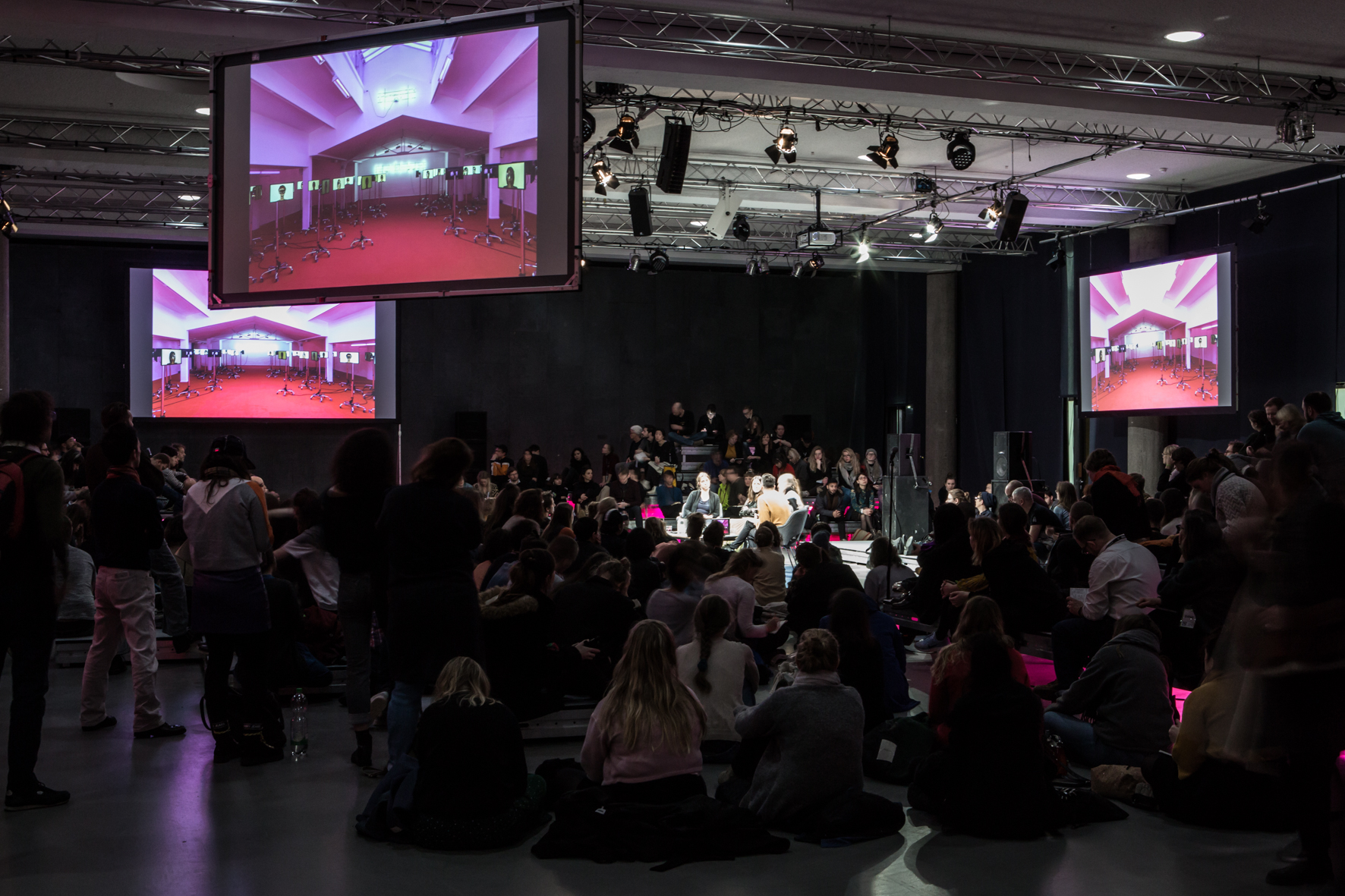 If indeed transmediale was coming down from the tower and reaching out, it did so very performatively. In many of its events, everybody—speakers and audience—literally sat together to discuss, butts on the ground. Instead of featuring an art show, the HKW’s exhibition hall was turned into what reminded me of a huge TV studio from the 90s—now repurposed for millennial teens and students: large silver screens floated far apart from one another above under lit rostra, spread out and piled one on top of the other. The content there was just as theatrical. Panels were followed by a meditative breathing exercise and then a heated debate (particularly a head-on confrontation with the founders of a co-living space) and then wrapped up with a participatory multimedia dance extravaganza. Meanwhile, In the more conventionally structured auditorium, instead of renown scholars, young poets and performers gave their spoken word keynotes.