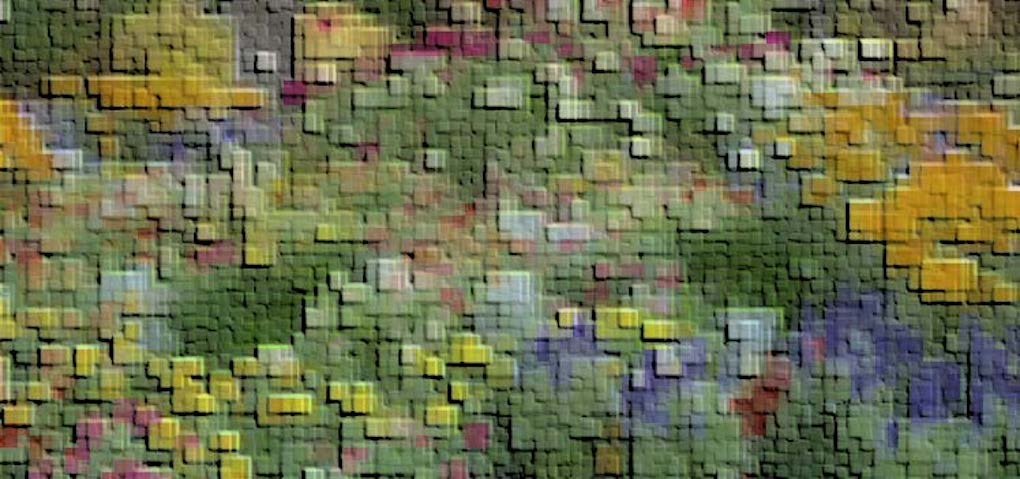 I was in my bubble as spring arrived and flowers bloomed after a long, bare, white, winter, bursting color and texture. Life. Making the quilt, nature is noticed, living and announcing this joyously to the world and to me. Splashes of color and knowing from bubbles and stitches. The image here of the neighborhood campus garden I walked in to gain respite from the pandemic is becoming-tapestry with pixelation (Figure 6) blurring the leaves and petals, shifting lines and making squares.