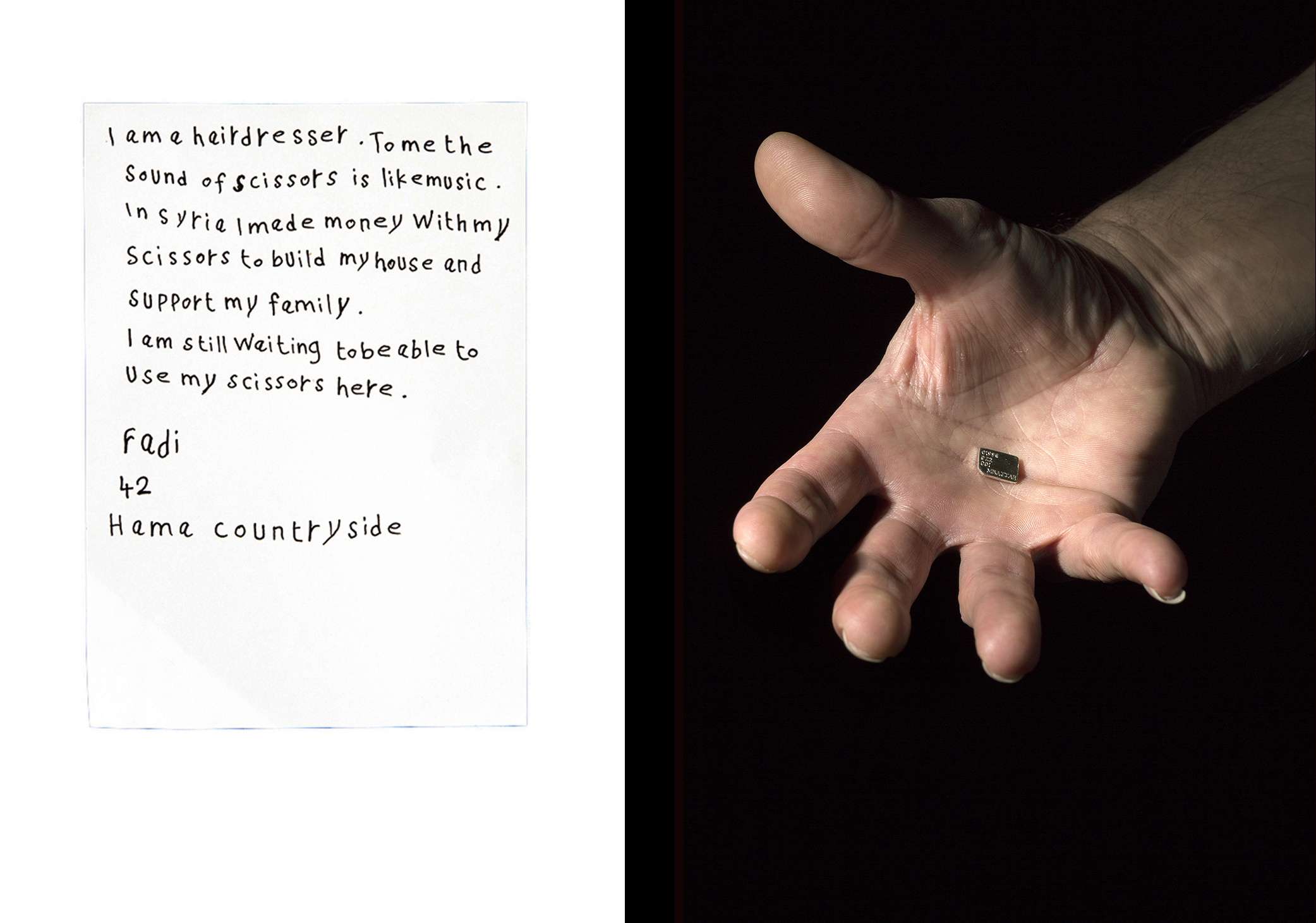 I commissioned a silversmith to make replica SIMs in solid silver. The participants’ designs based on their drawings were engraved onto the SIMs, as presented in the photographs below. To mirror the codes on the back of standard SIM cards, participants submitted meaningful numerical configurations, such as dates of arrival in Coventry, deaths of loved ones in Syria, and birth dates. The use of silver was symbolic; refined silver smithing is a craft with which the city of Coventry has long associations, and silver is also the most conductive metal—a emblem of connection. The sculptures were gold plated to replicate the layer of gold on actual SIM cards and to emphasize their treasured emotional and practical value today. In the exhibition the SIMs, engraved with the experiences, needs, and aspirations of recently arrived Syrian refugees, were presented alongside selected keys from the museum’s collection dating from the 12th through to the 19th centuries. The new artifacts were also acquired by the Herbert collection.
