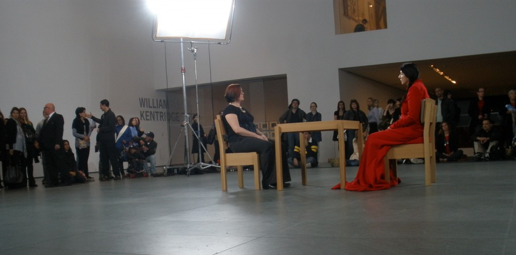 One does not usually sit across from someone and stare at her or him without speaking for a long period of time, and at first, I was a little unsettled by this lack of verbal communication. Secondly, I was a little star struck. “I am sitting across from Marina Abramović,” I kept telling myself over and over in my head. As a contemporary art historian, I had taught her work to my students many times, and my recent forays into performance art had made me admire her even more. I thought that I would be overly aware of being watched by the crowds that continually mill around the perimeters of the performance space, but this was not the case. I was struck by how tired she looked and thus found myself trying to consciously send her positive energy, and then it felt as if energy was being sent back to me. I began to understand why so many people had cried while sitting across from her, or had sat there for hours on end because it was, to my surprise, quite a profound experience in that you become completely present in that moment. Perhaps it was the waiting, or the atmosphere, or the simple act of just looking at someone and trying to communicate without words, but everything except that wordless communication faded away. Time became irrelevant and despite being surrounded by crowds, I was entirely focused upon looking intently at just one other person. This kind of focus is not an experience one typically gets to have in everyday life. When I finally pried myself away, a surprisingly difficult task, I was told by the women behind me in the line that I had sat there for over twenty minutes. I was shocked, as I had lost all track of time, and it was only remembering the promise that I made to them that had got me out of that chair. I went to stand with the onlookers; some people came up to me to ask me what it had been like.