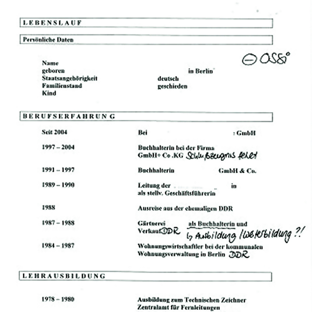 An East German woman’s application to a Western employer marked down “Minus Ossi” © dpa / n24.de (IMAGE 8) – Click Image to Continue