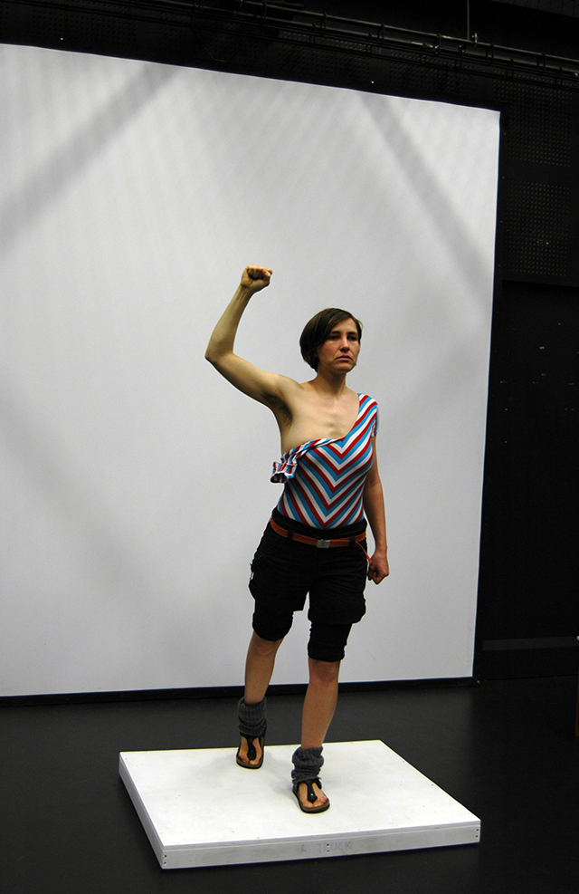 As part of the Bodies of Crisis project, we realized performance research on the relationship between cultural stereotypes rooted in public discourse that links everyday practice to political struggle. The creation of living statues targeted the visualization of the fashion-based, temporal, and cross-cultural elements of symbolism and aimed to account for their situatedness in localized political narratives and cultural discourses. The image shown here depicts the design of a performance response to the research question: how can we ascribe politics of the body their space in situated—that is, local and culturally specific—historiography without unnecessarily exoticizing it?