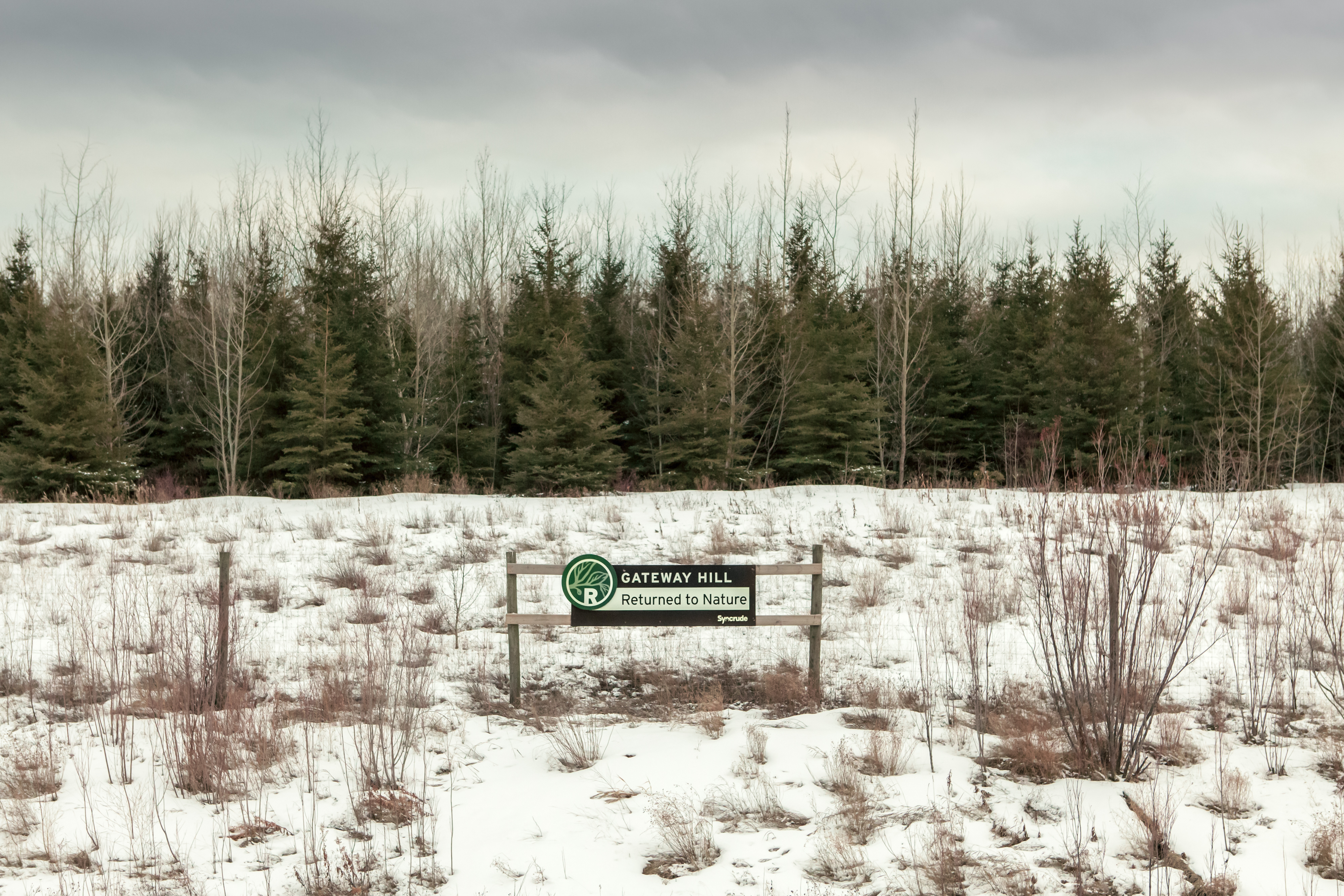 Figure 11: “Returned to Nature” claim by the company Syncrude Canada Ltd., which owns 400 square miles of open-pit mines, refineries, man camps, and toxic tailings lakes in the area. Resembling a nature preserve, Gateway Hill is a privately owned estate of roughly 100 square miles of evenly planted conifers, rectangular ponds, and grids of sod, sand, and muskeg. Steve Rowell, Midstream at Twilight, production still, 2015-16.