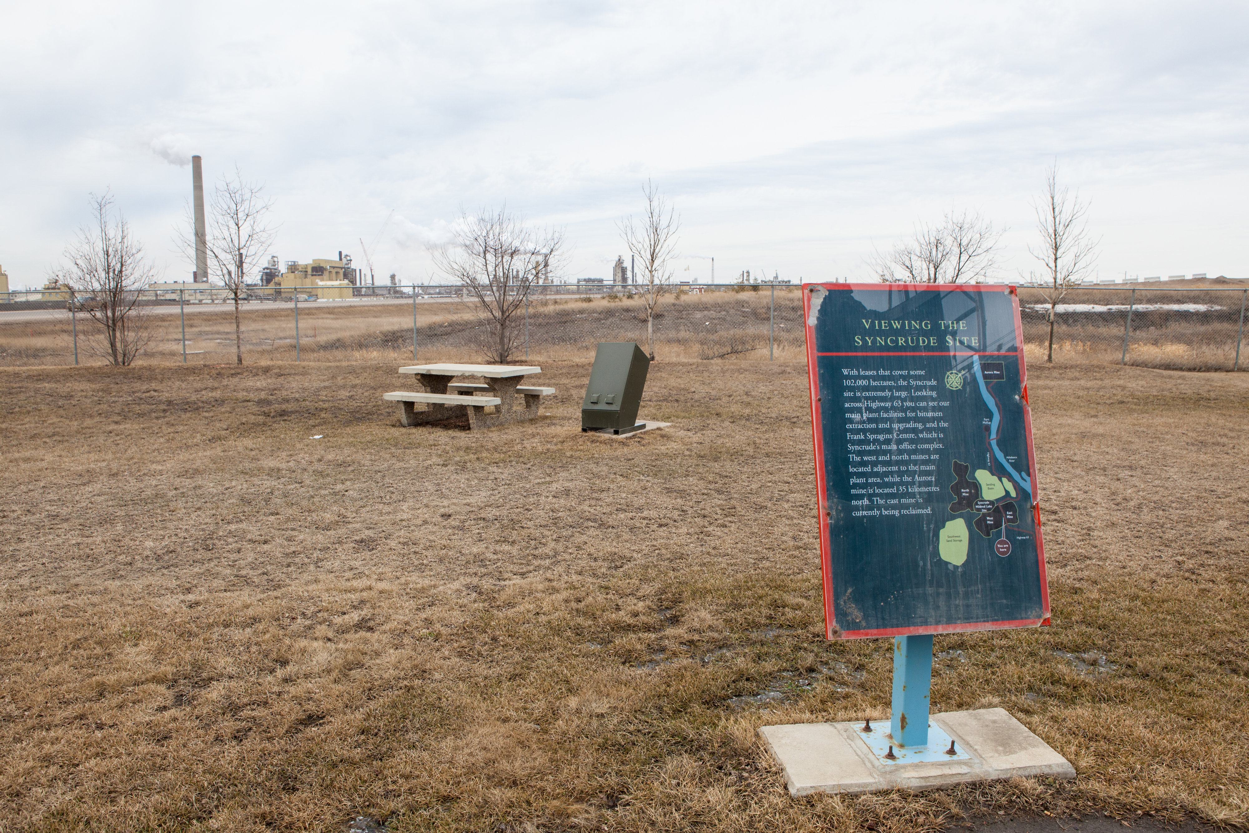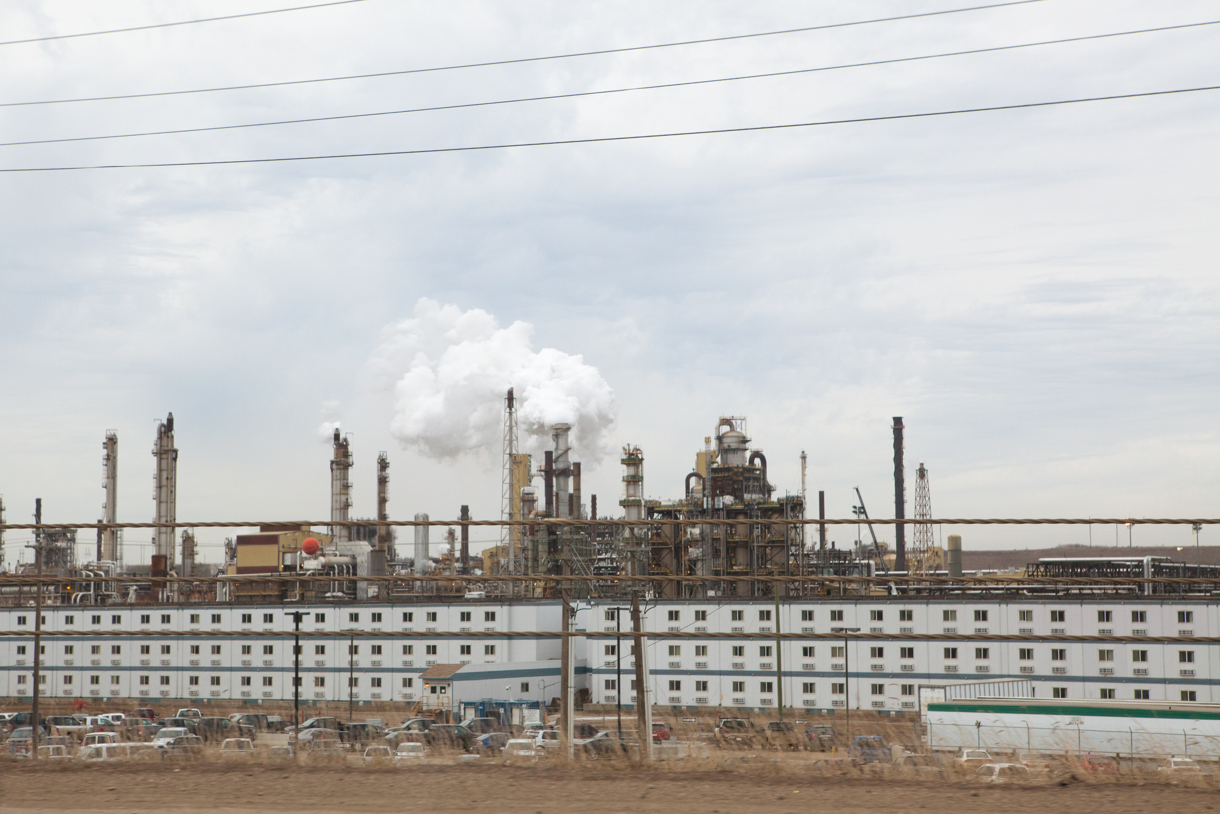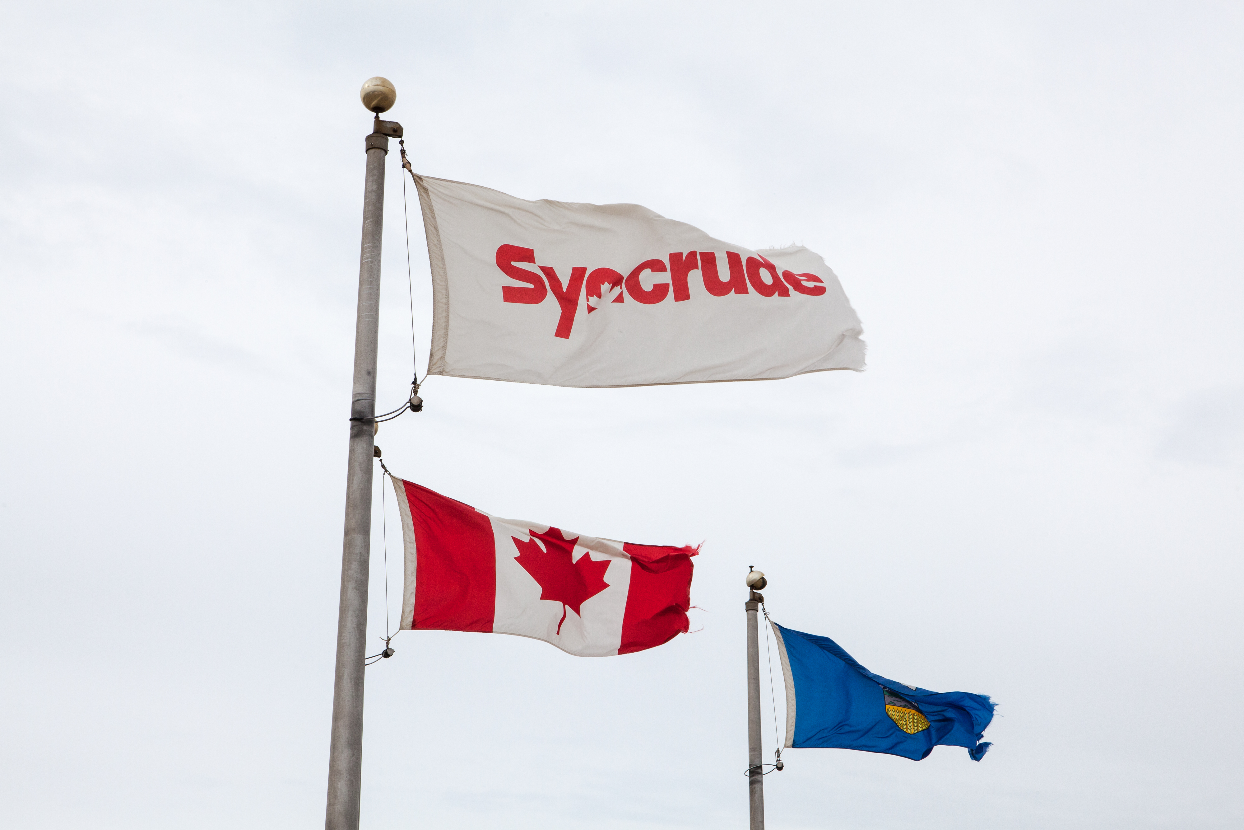 Figure 15: Syncrude is the world’s largest producer of synthetic crude oil from oil sands. They produce 350,000 barrels per day and have leases on 12 billion barrels worth of oil sands, which will keep them mining and producing for another 90-100 years at this capacity. Most of this oil is pumped across North America through thousands of miles of buried pipelines. Their corporate flag is often seen flying above the Canadian national flag. Steve Rowell, Midstream at Twilight, production still, 2015-16.