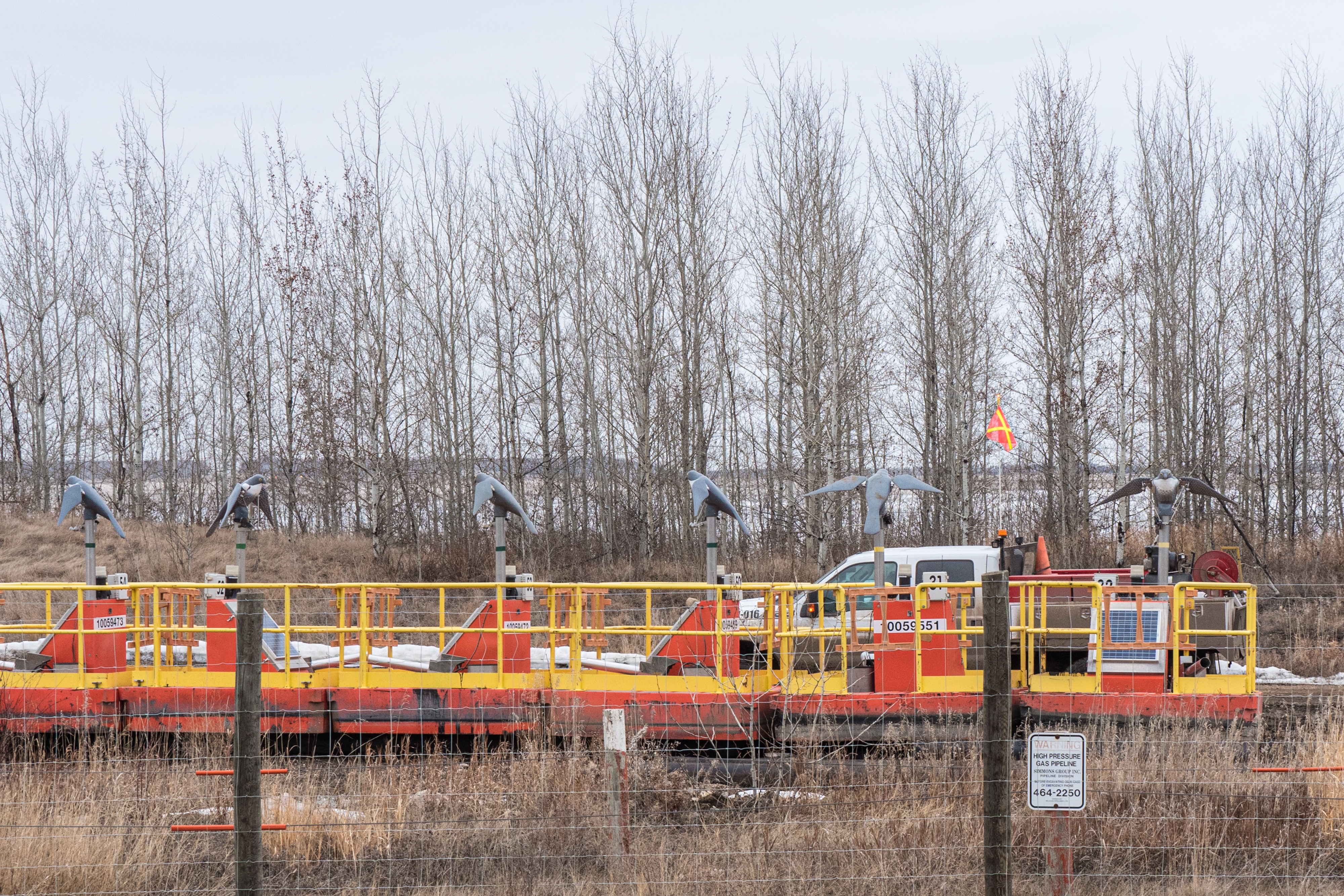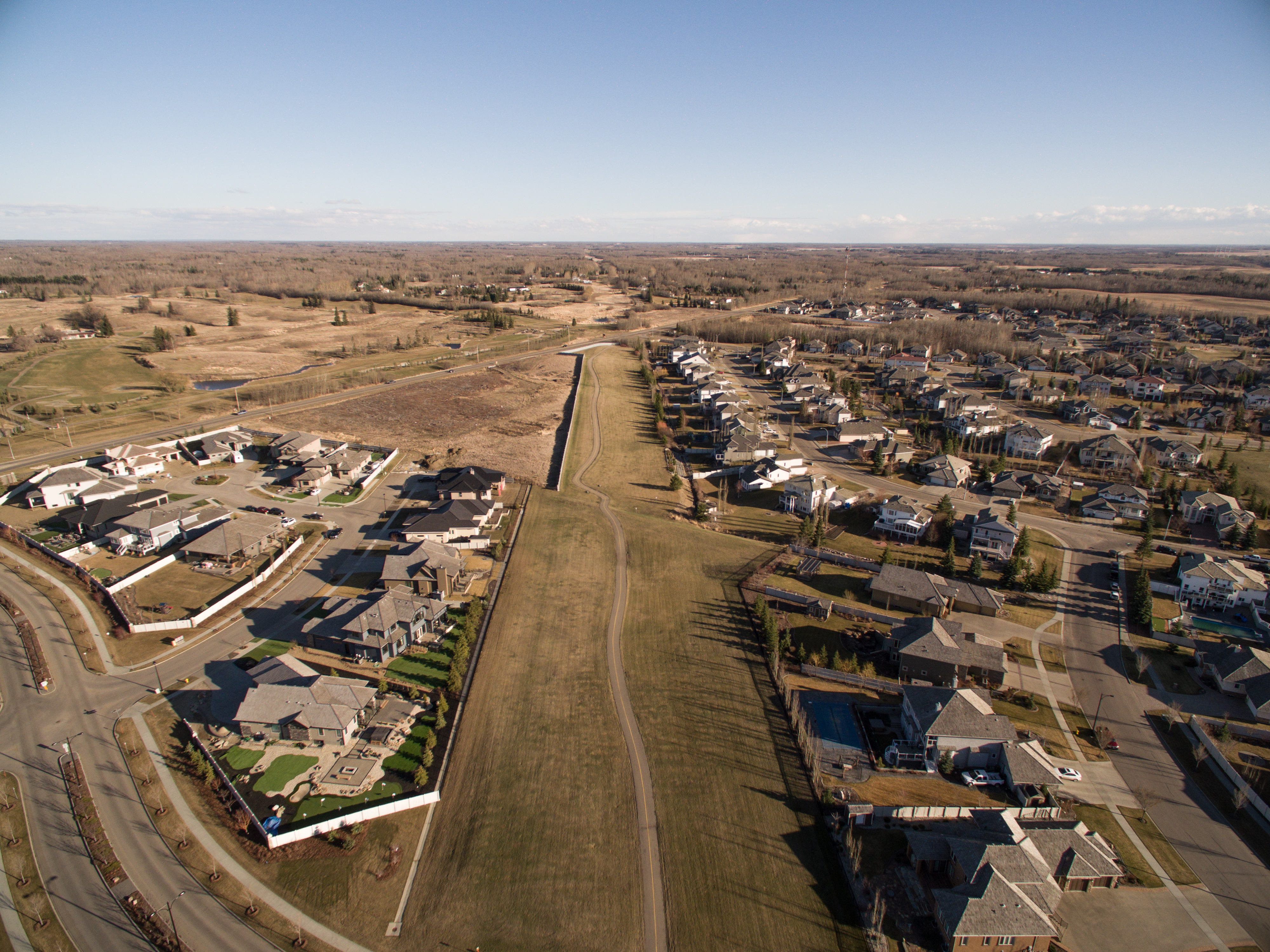 Figure 21: Tar Sands diluted bitumen pipelines run beneath this clear swath of land, dividing this subdivision in suburban Edmonton, Alberta. The oil in these pipelines, owned by Enbridge Inc., flows at five miles per hour across the plains of North America, terminating at refineries in Minnesota, Illinois, Indiana, Louisiana, and Texas. Steve Rowell, Midstream at Twilight, production still, 2015-16.