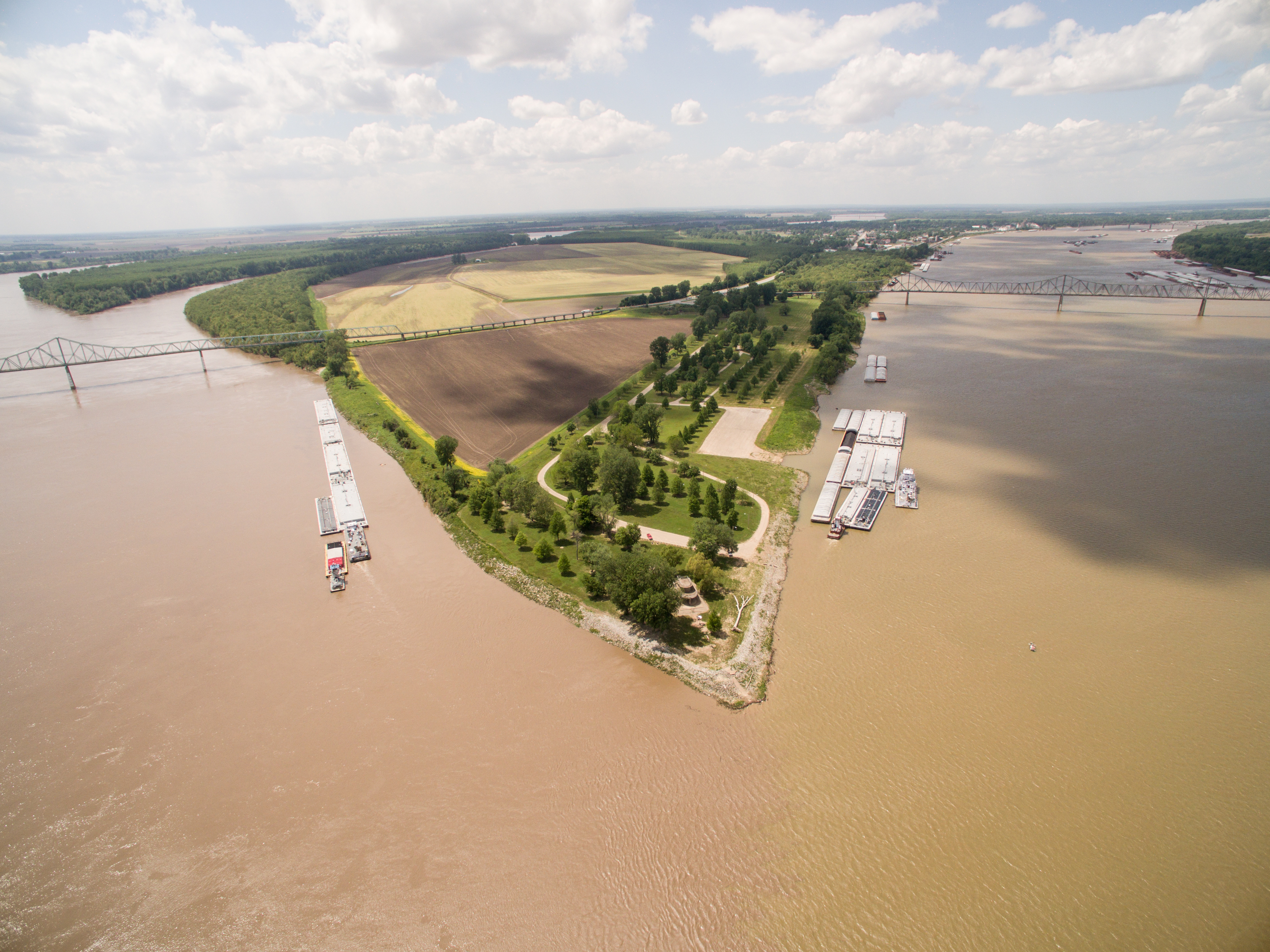 Figure 22: Barges carrying petcoke from bitumen oil refineries in the Midwest move down the confluence of the great Mississippi and Ohio Rivers to ports in the Gulf of Mexico and beyond. Steve Rowell, Midstream at Twilight, production still, 2015-16.