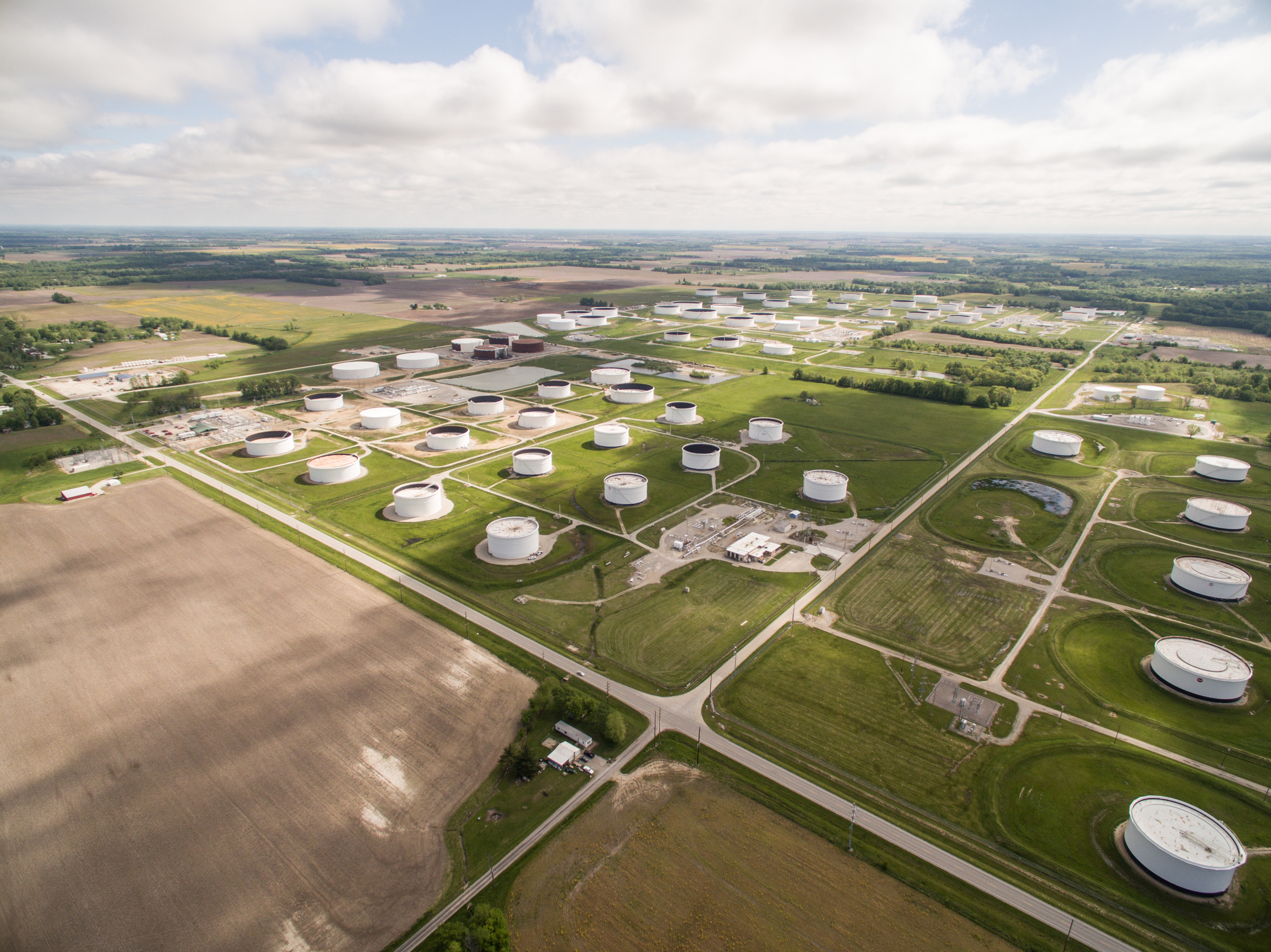 Figure 23: Storage tanks of tar sands oil along the Marathon Pipeline site in Vernon, Illinois. Steve Rowell, Midstream at Twilight, production still, 2015-16.