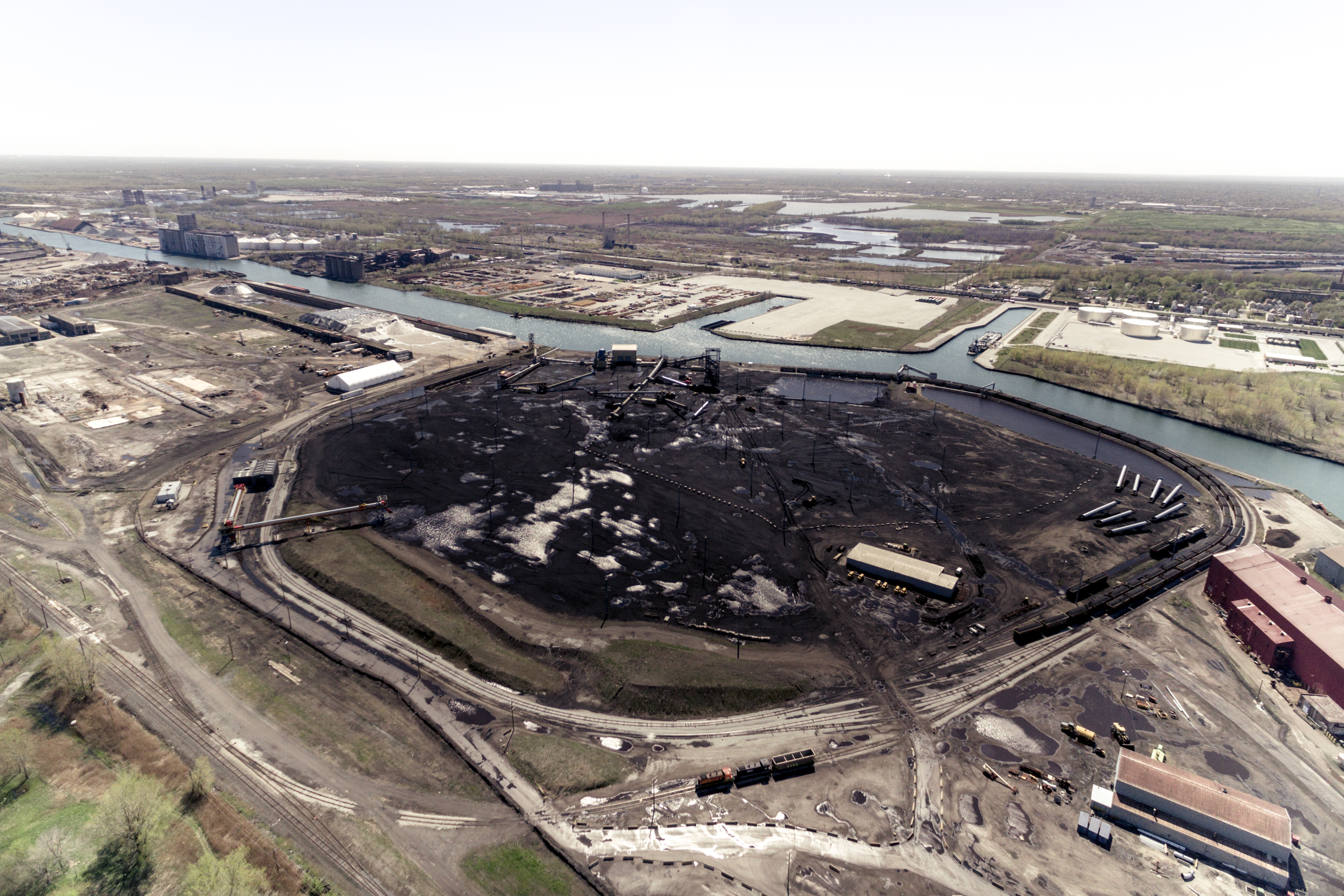 Figure 24: Koch Industries, Inc. KCBX petcoke terminal, South Chicago. This terminal is anything but. Petcoke, a waste product of the refining of crude oil and tar sands bitumen, is sent downstream by rail and barge and, eventually, by tanker to countries in Asia like China where it is burned in power plants. The material accretion of the North American fossil fuel industry may terminate in those furnaces, but the chemical toxins return home, in the form of global greenhouse gases and runaway climate change. Steve Rowell, Midstream at Twilight, production still, 2015-16.