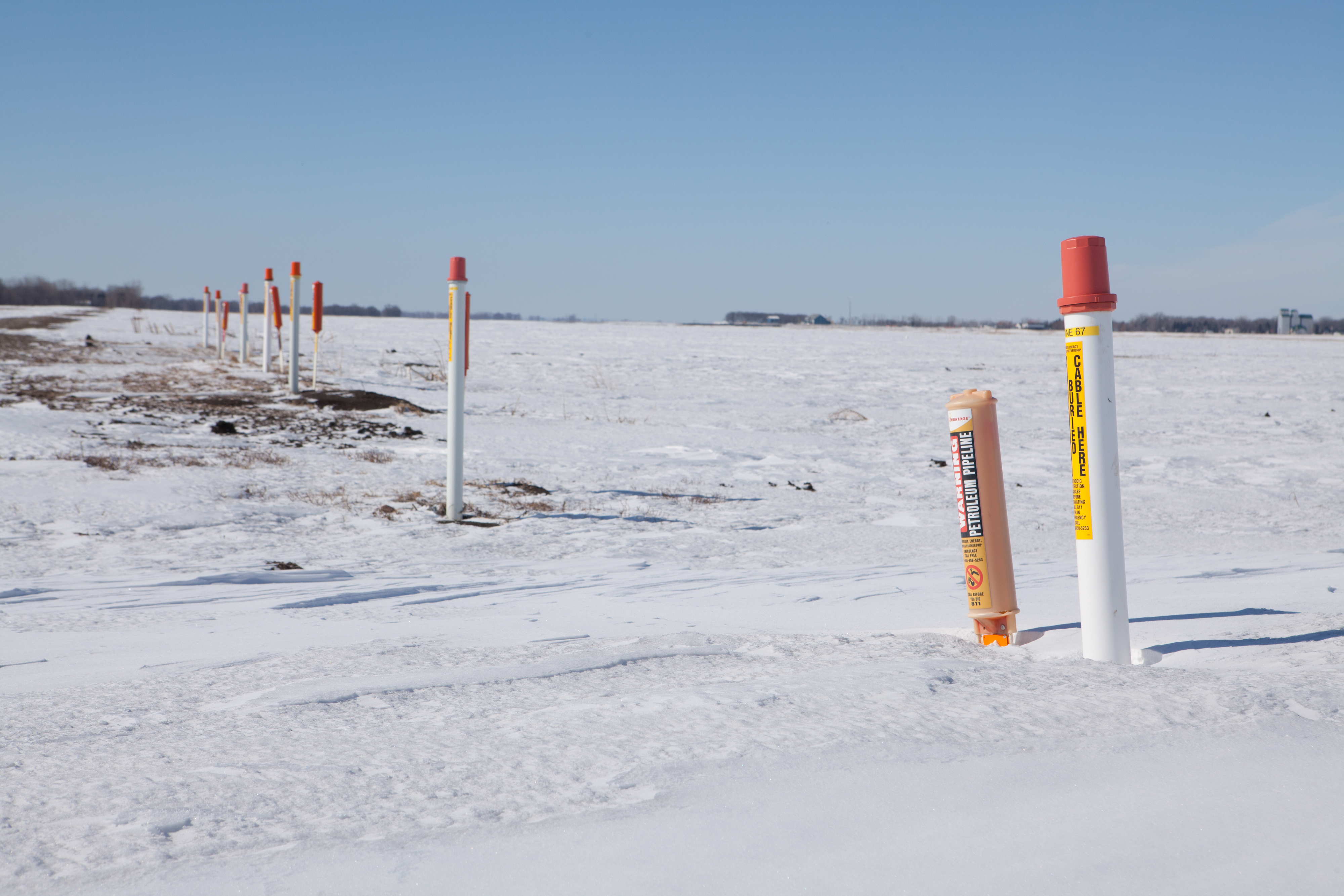 Figure 9: Enbridge owns many of the pipelines bringing tar sands oil to the USA from Canada. Just south of the border, in northern North Dakota, markers alert farmers, construction crews, and drivers, warning them to not dig and carry on, ignoring the infrastructure. If not for regulations, these markers wouldn’t exist and the pipelines would be completely covert. Steve Rowell, Midstream at Twilight, production still, 2015-16.